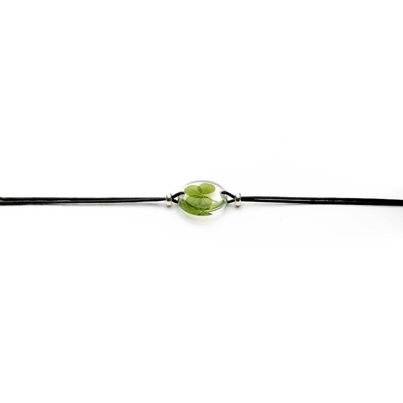 Hand-cast in epoxy resin on a 20mm disc, a young perennial clover mounted as a bracelet on a waxed cord adjustable by a sliding knot. 2 Gold Filled* pearls on either side of the medallion.