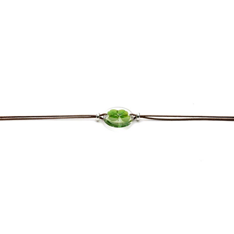 Hand-cast in epoxy resin on a 20mm disc, a young perennial clover mounted as a bracelet on a waxed cord adjustable by a sliding knot. 2 Gold Filled* pearls on either side of the medallion.