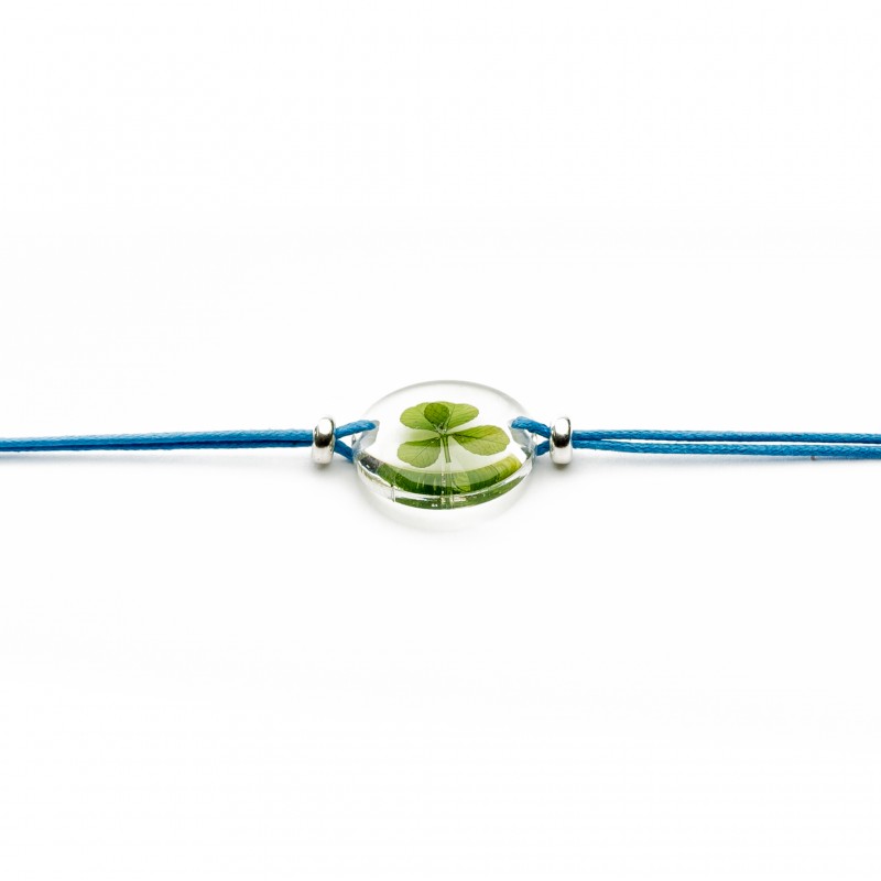 In a 20mm resin encasement, a young perennial clover mounted as a bracelet on a waxed cord adjustable by a sliding knot. Two 925 sterling silver beads on either side of the medallion.