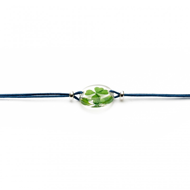 In a 20mm resin encasement, a young perennial clover mounted as a bracelet on a waxed cord adjustable by a sliding knot. Two 925 sterling silver beads on either side of the medallion.