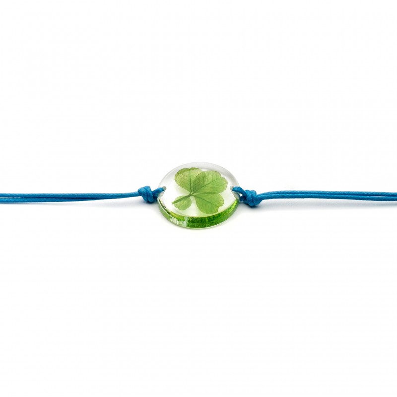 En inclusion sous résine époxy coulée main sur une pastille de 20mm, un tout jeune trèfle pérennisé monté en bracelet sur un cordon ciré réglable par un double nœud coulissant.
