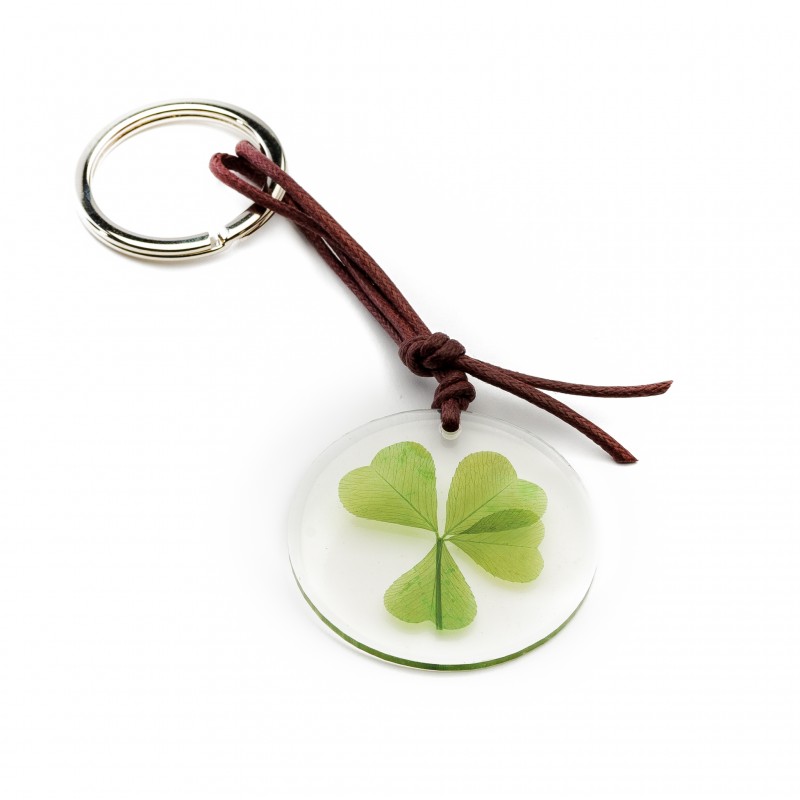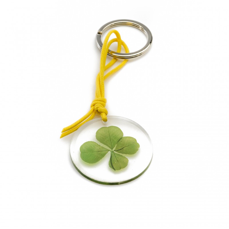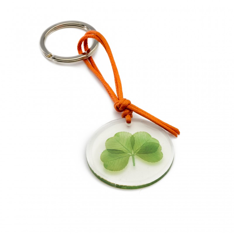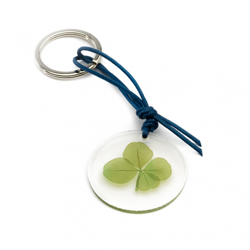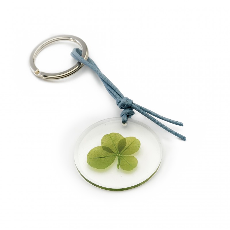 Trèfle en inclusion sous résine époxy coulée sur un disque fin de 45mm monté en porte-clés par une boucle de coton ciré amarrée à un anneau plat fendu en acier.